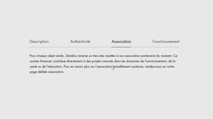 Chaque achat sur Starelics a du sens : un tiers du prix est directement reversé à l’association caritative du moment.
